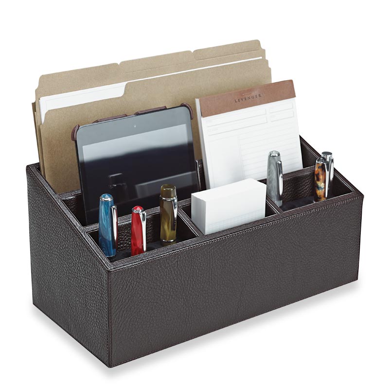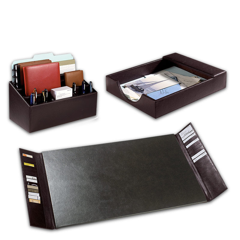 Our intrepid full-grain Bomber Jacket leather, used in the jackets of World War II fighter pilots, makes handsome and durable desk accessories. Set of three pieces includes the , the r (which includes storage for pens, notebooks and files) and .