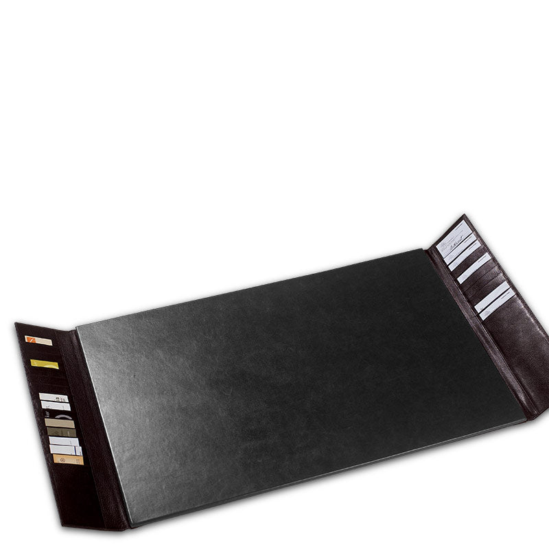 A distinctive desk mat for larger desks. Our Bomber Jacket leather makes durable deskware and helps keep your workspace beautifully organized. The fold-up wings on either side offer card storage underneath: the left side can hold 15 business cards, and the right side 10 3 x 5 index cards. The smooth writing surface can be used with or without blotter paper, and the felt bottom protects your desk.