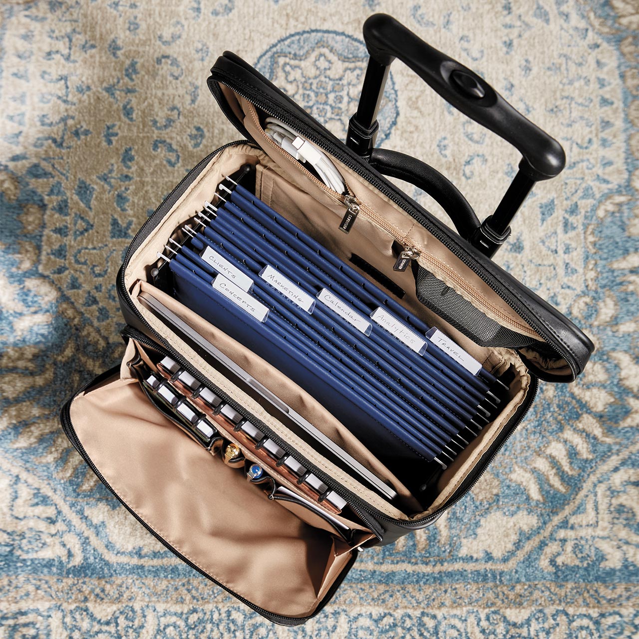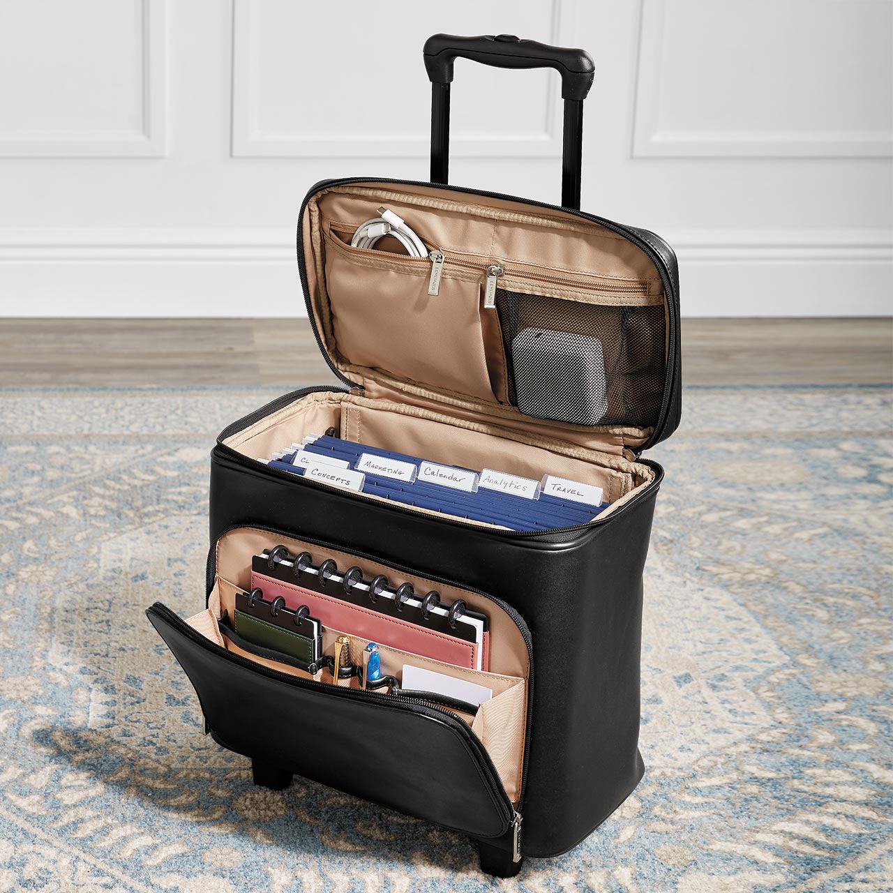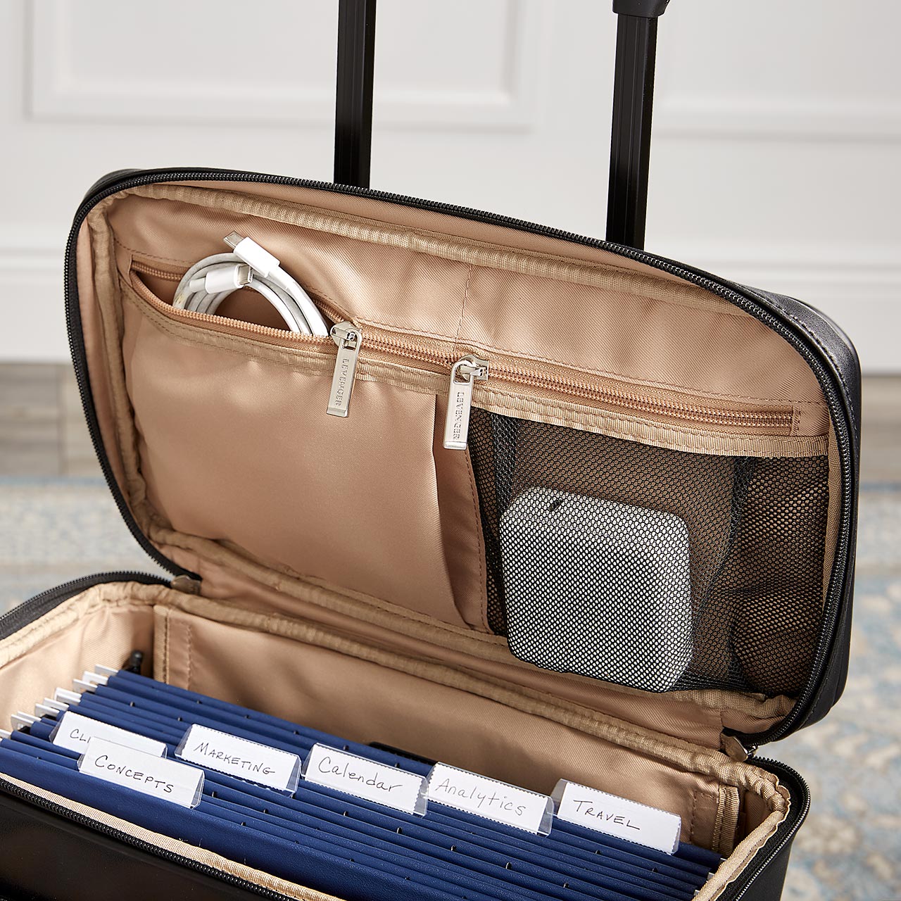 Get your act together and take it on the road with our zip-secure Portable File Tote on wheels, built for longevity in our premium LevTex™ leather alternative. Inside this compact mini rollaboard is room for your laptop and files, plus a wealth of storage and pocketing (see details below). The telescoping handle extends and retracts with the push of a button and the dual-wheel system ensures smooth and seamless perambulation.