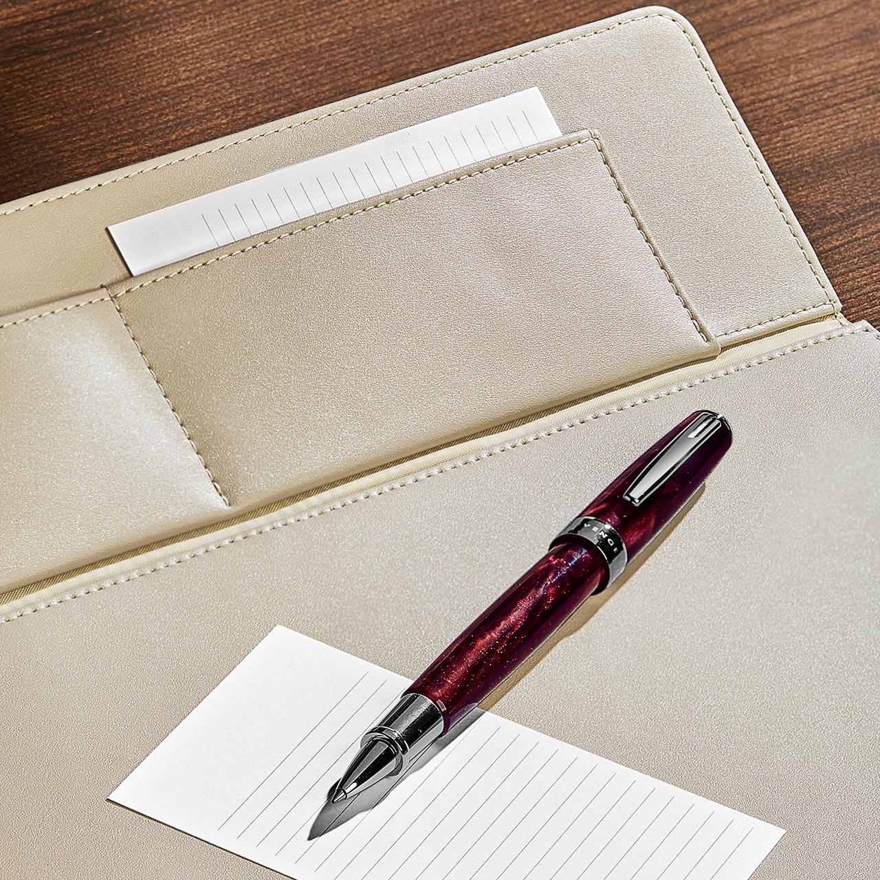 Organize your desk with the understated elegance of a leather desk blotter in our rich, smooth midnight blue Luxe leather. This handsome leather desk mat sports a cradle for your favorite pen as well as pockets for 3 x 5 cards under the flap.