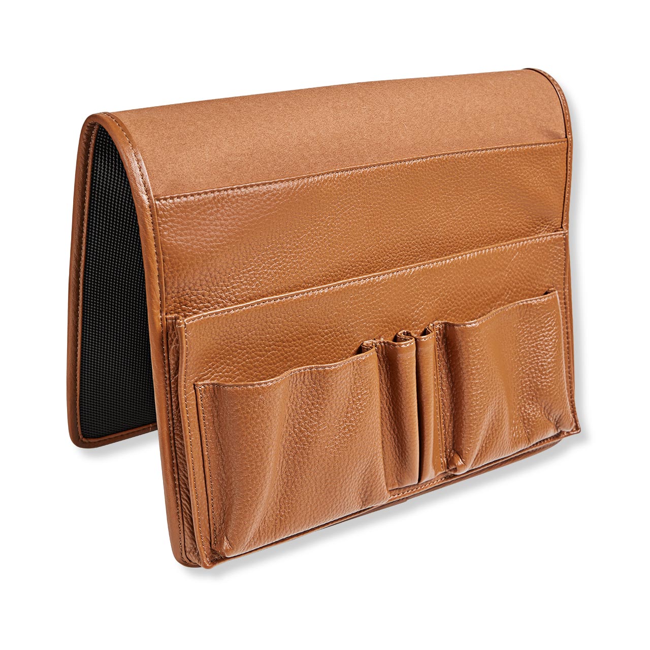 If you love reading in bed, this take-with-you caddy, crafted in soft leather, tucks sweetly under the mattress—and it’s equally useful thrown over the arm of a sofa or chair. Keep your reading materials, eyeglasses, journal and pens close at hand at bedtime, or use in the TV room to hold magazines, newspapers and all the remotes, too. Crafted in our lusciously soft full-grain leather and lined in microsuede to keep tools protected, the Bedside Companion helps minimize clutter on desks and nightstands and makes your essentials fully portable.