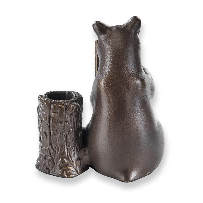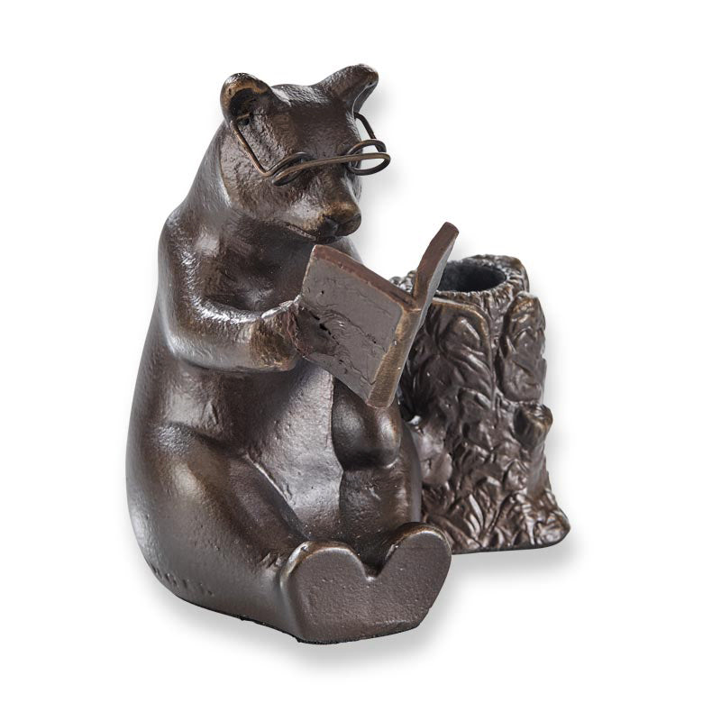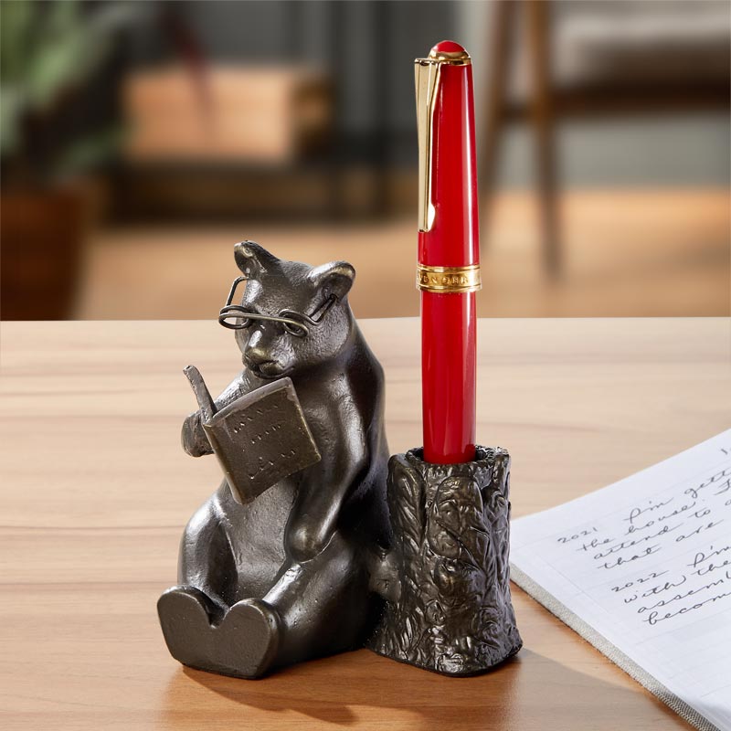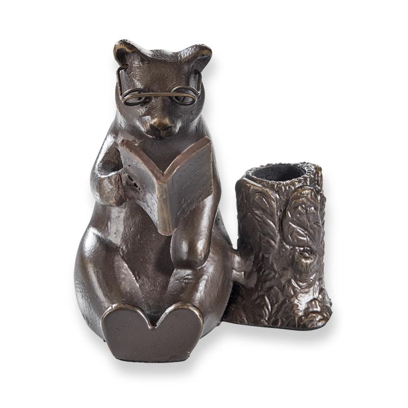 Our beloved reading bear pen holder is a perennial favorite. He knows no one will steal your pen in his natural habitat, the middle of the forest, next to his favorite hollow stump…so he can enjoy his reading in peace, with nary a need to growl. Made using the time-honored lost-wax process for optimal detail: The artist first creates a model in clay which is covered with silicone rubber to create a negative 3-D image. The hollow silicone is filled with liquid wax, then carefully bathed in ceramic. Molten metal is poured inside, dissolving the wax. After the metal cools, the mold is broken away to reveal the beauty beneath.